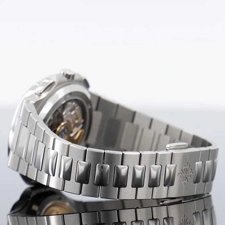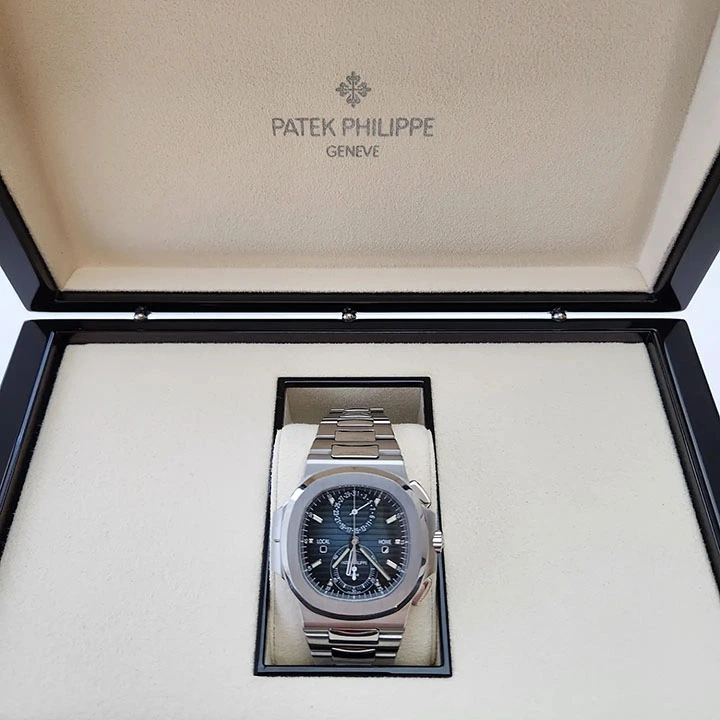 The Ref. 5990/1A-011 Nautilus Travel Time chronograph is one of Patek Philippe’s rare steel watches. It features a new blue dial
