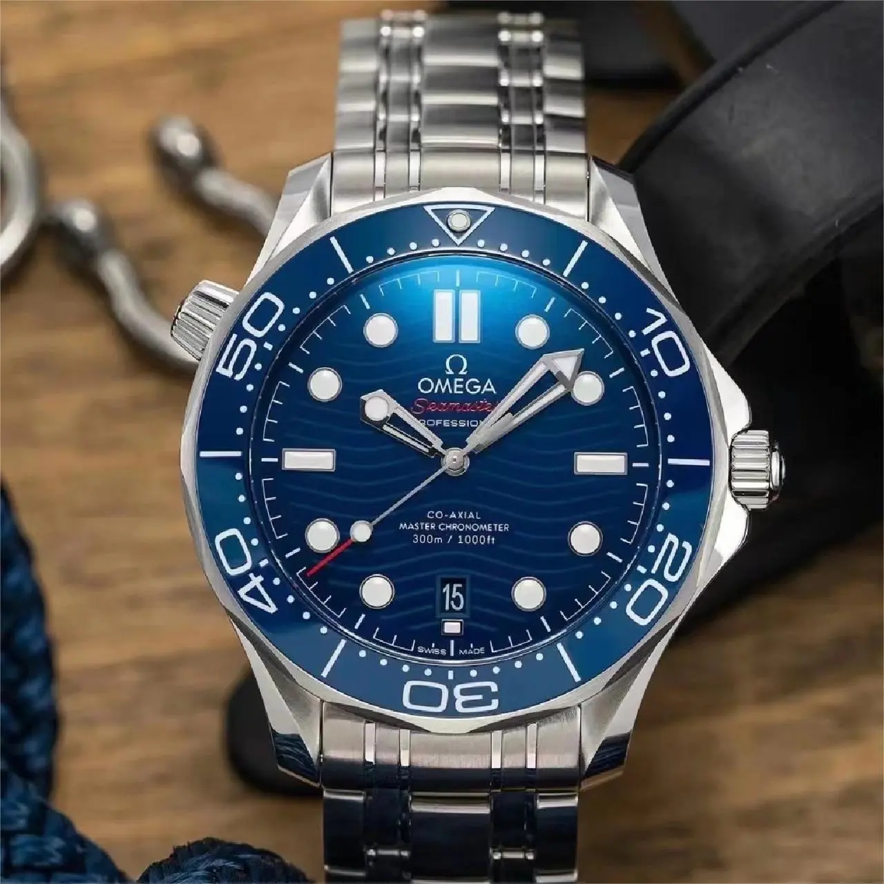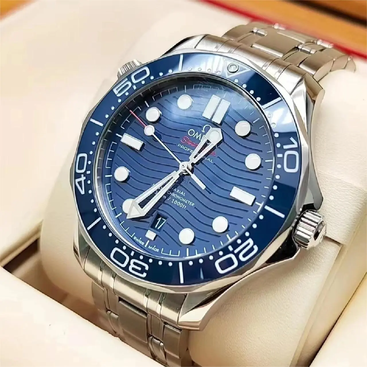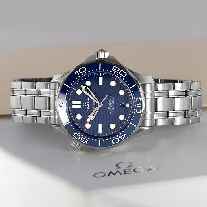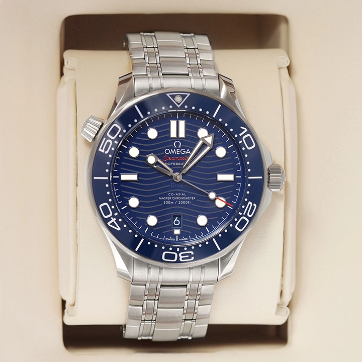This 42 mm model is crafted from stainless steel and includes a blue ceramic bezel with a white enamel diving scale. The dial is