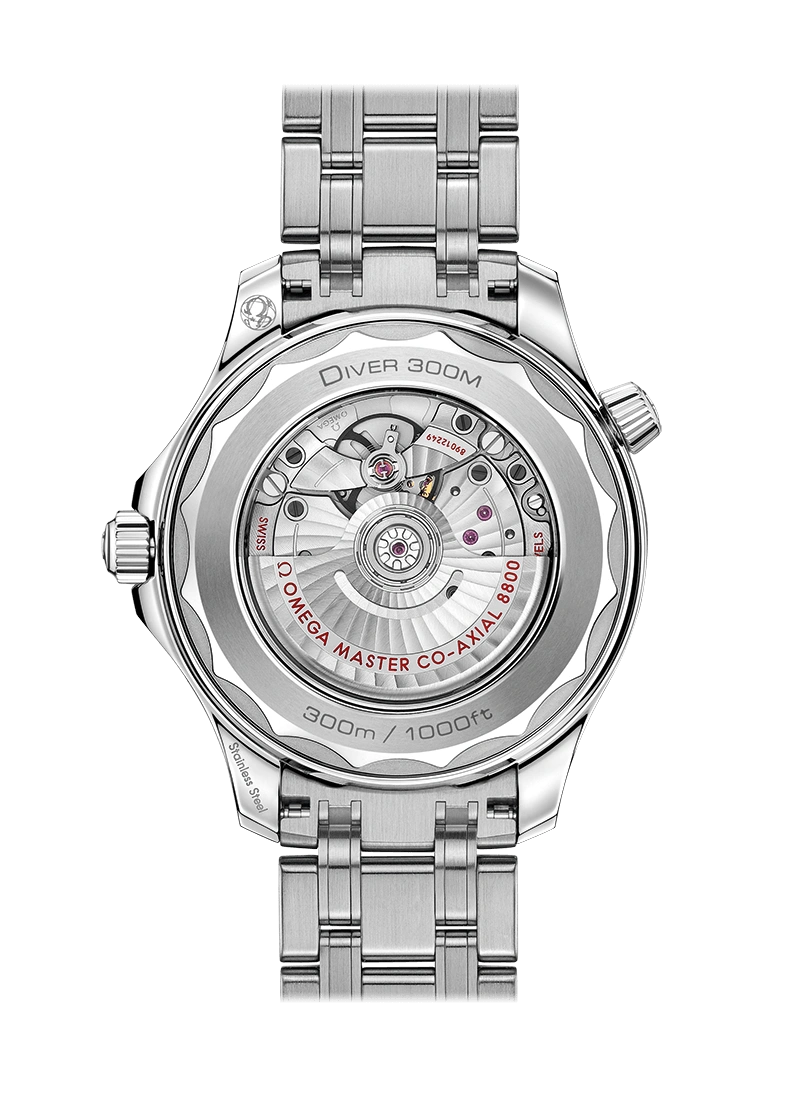 The watch is presented on a stainless steel bracelet and is driven by the OMEGA Master Chronometer Calibre 8800, which can be seen