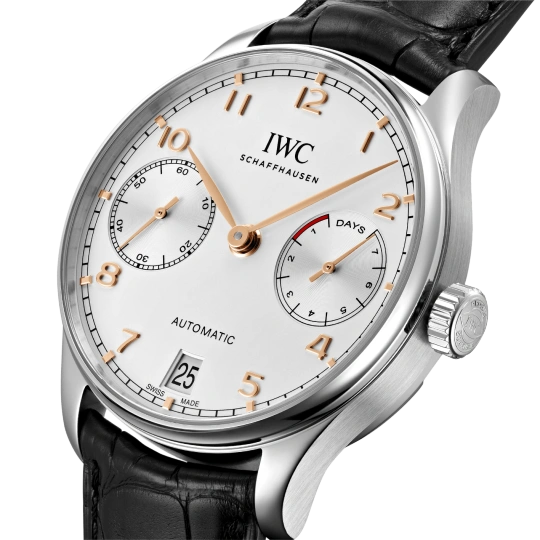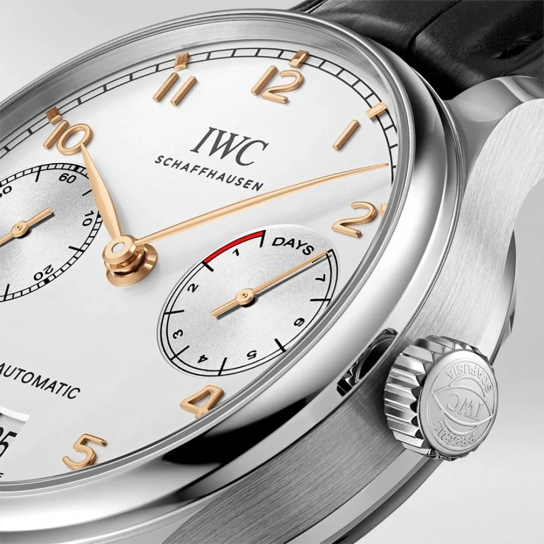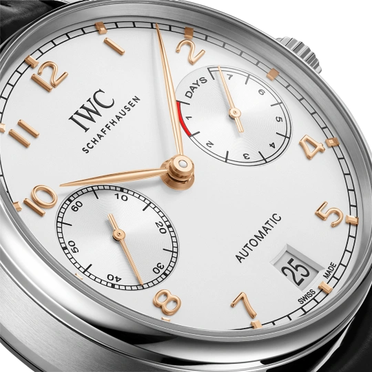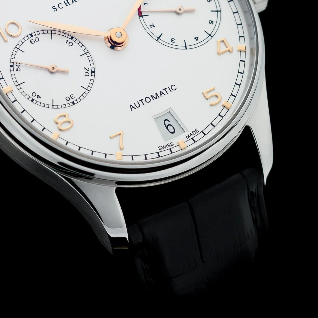with rose gold leaf-shaped hands and Arabic numerals. Minute markers around outer rim.
