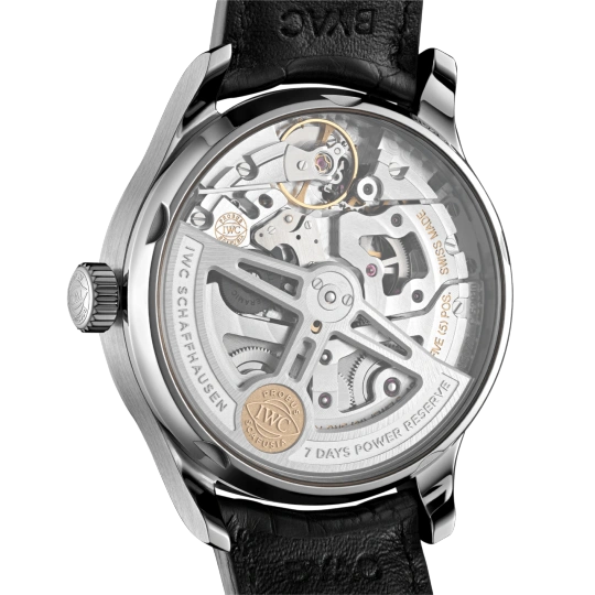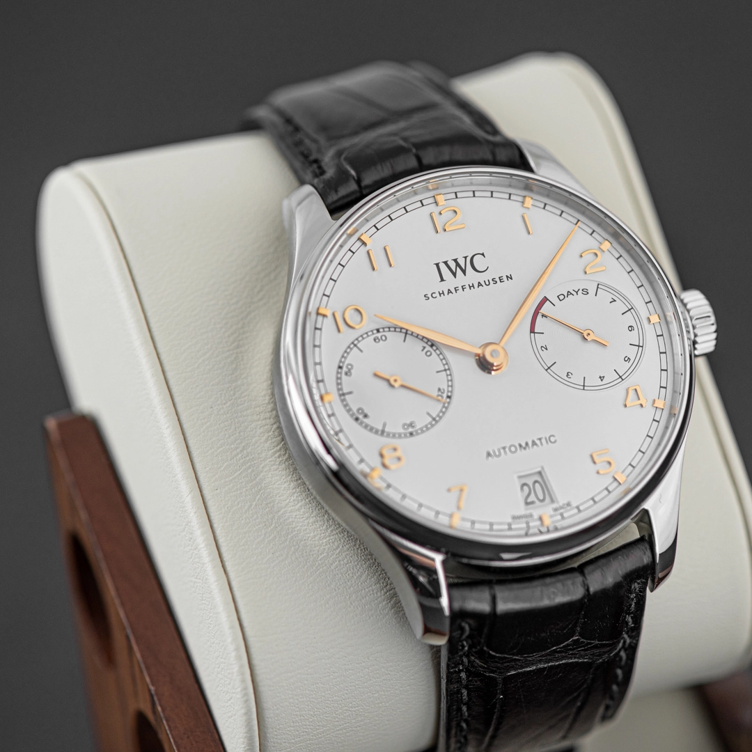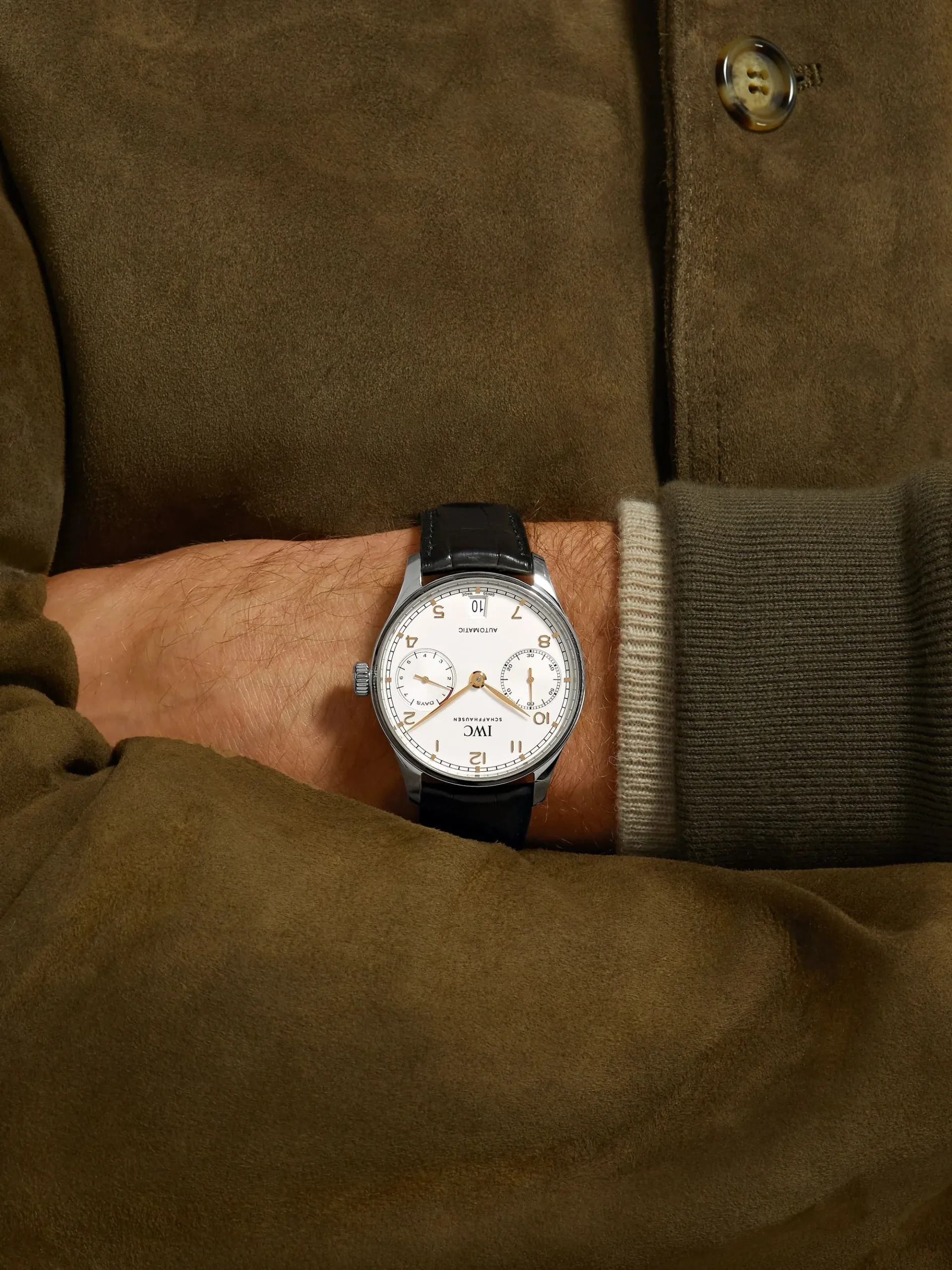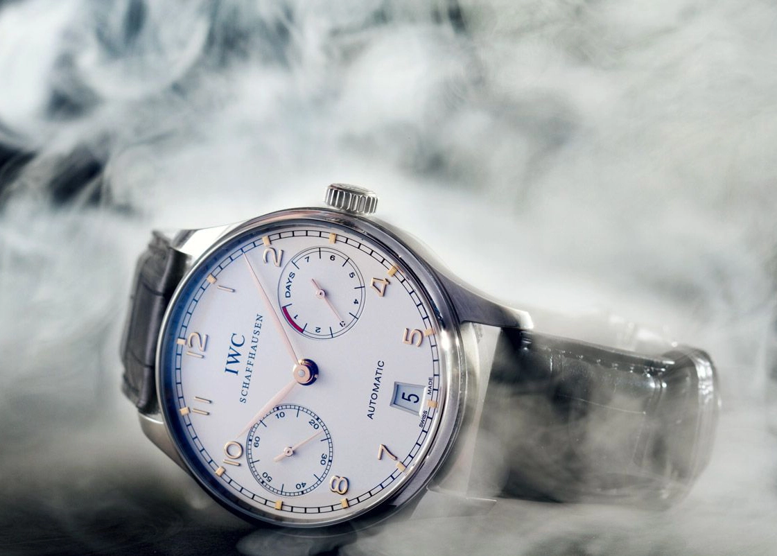 with rose gold leaf-shaped hands and Arabic numerals. Minute markers around outer rim.