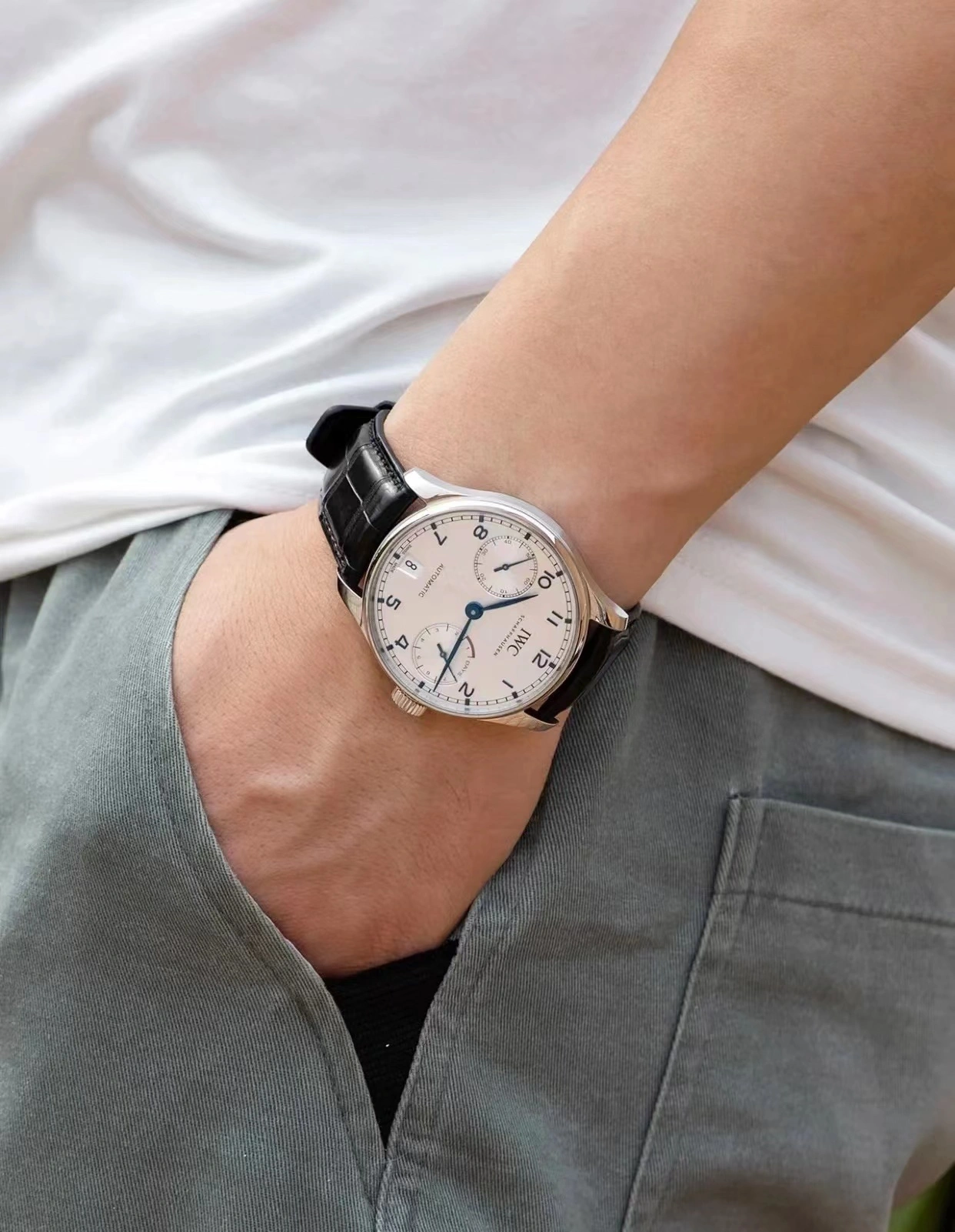the original IWC Portugieser first released in the 1930’s. It’s comfortable 42.3mm stainless steel profile pairs perfectly with