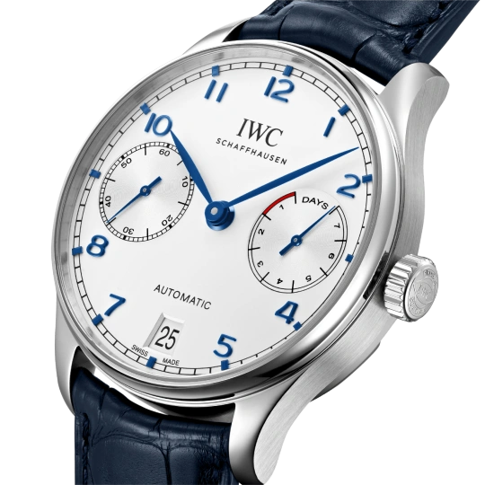 the silver plated dial with blue hands and appliques and matching blue alligator leather strap. Housed within is the IWC-