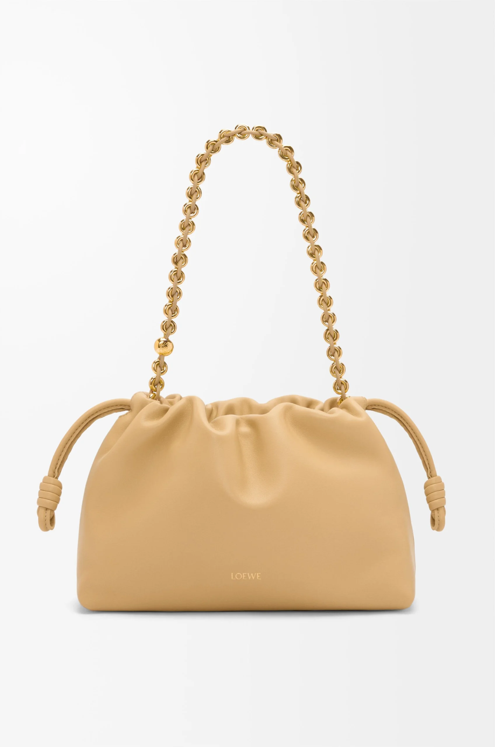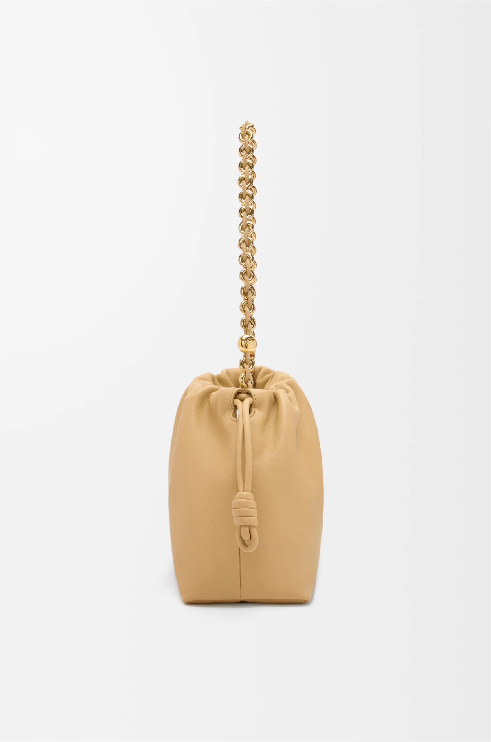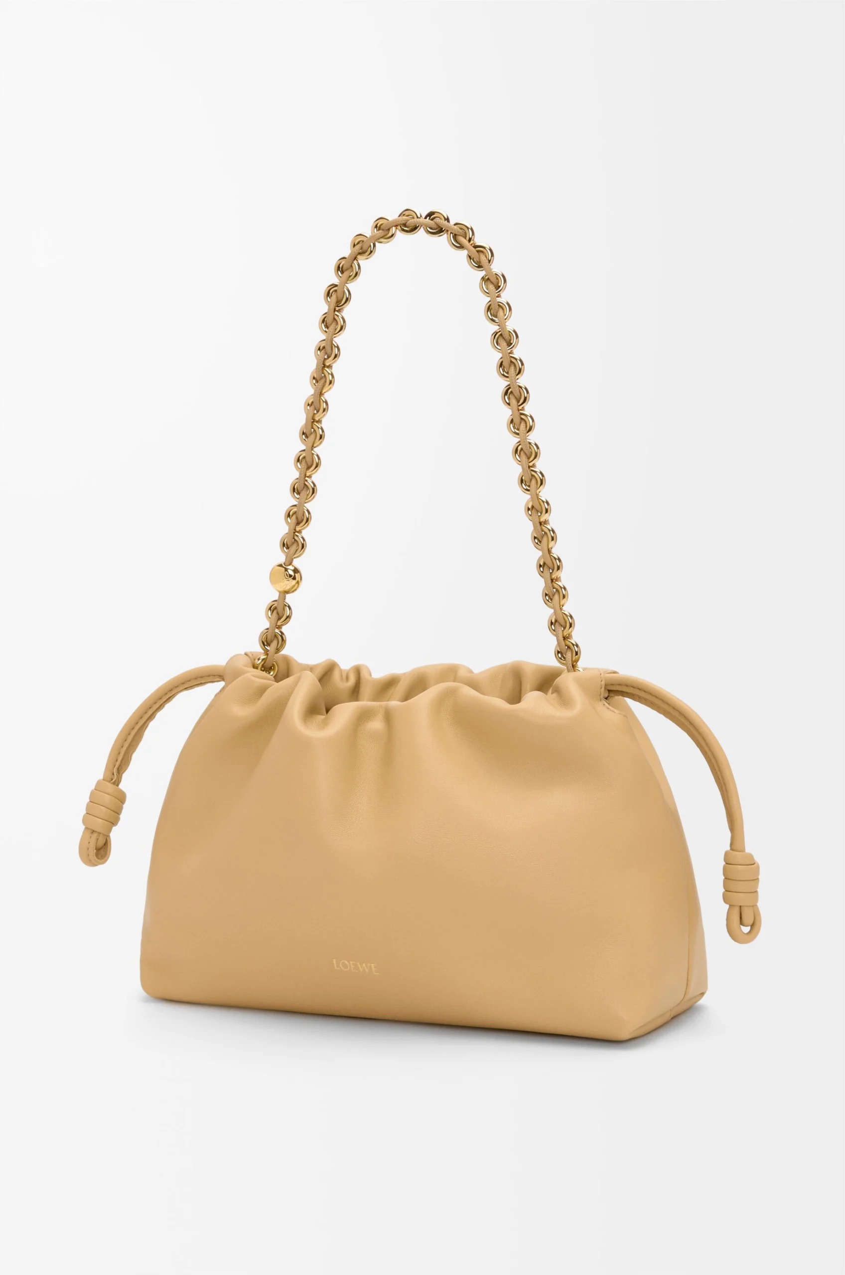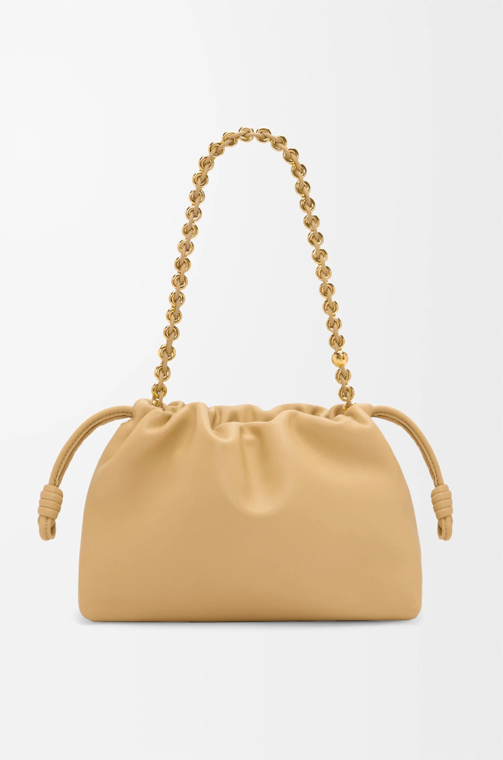 The Flamenco purse is a lightweight and soft bag with a ruched shape, historical knot drawstrings and a donut chain. This medium