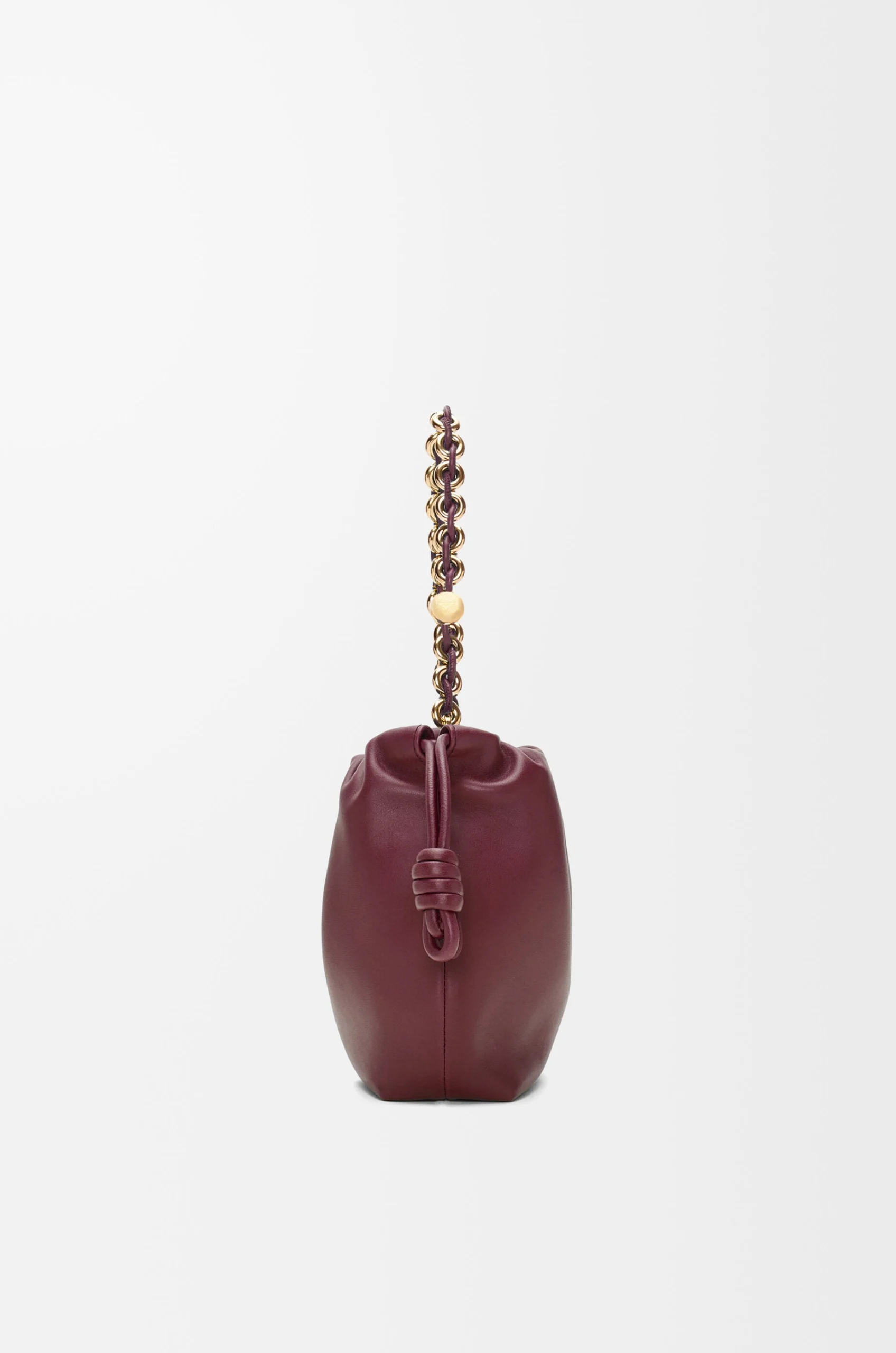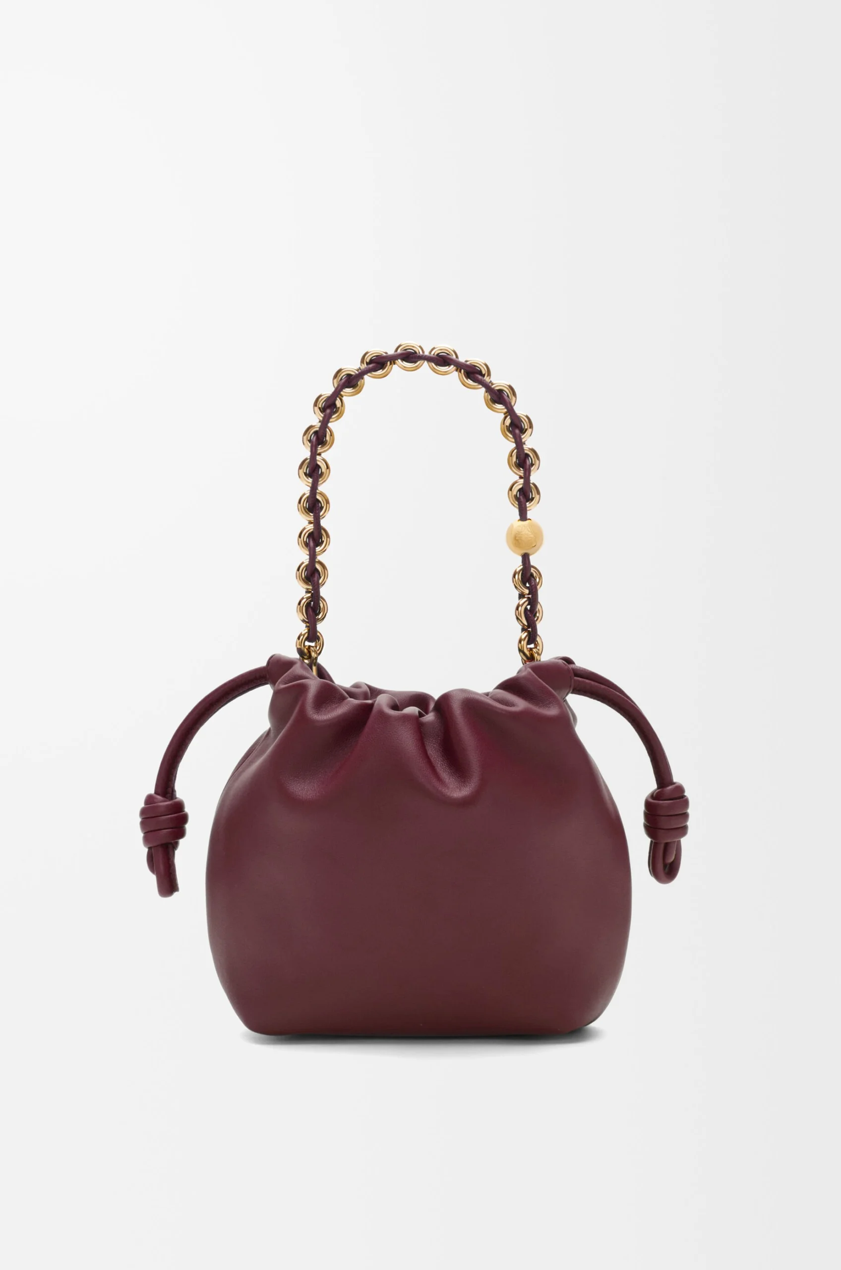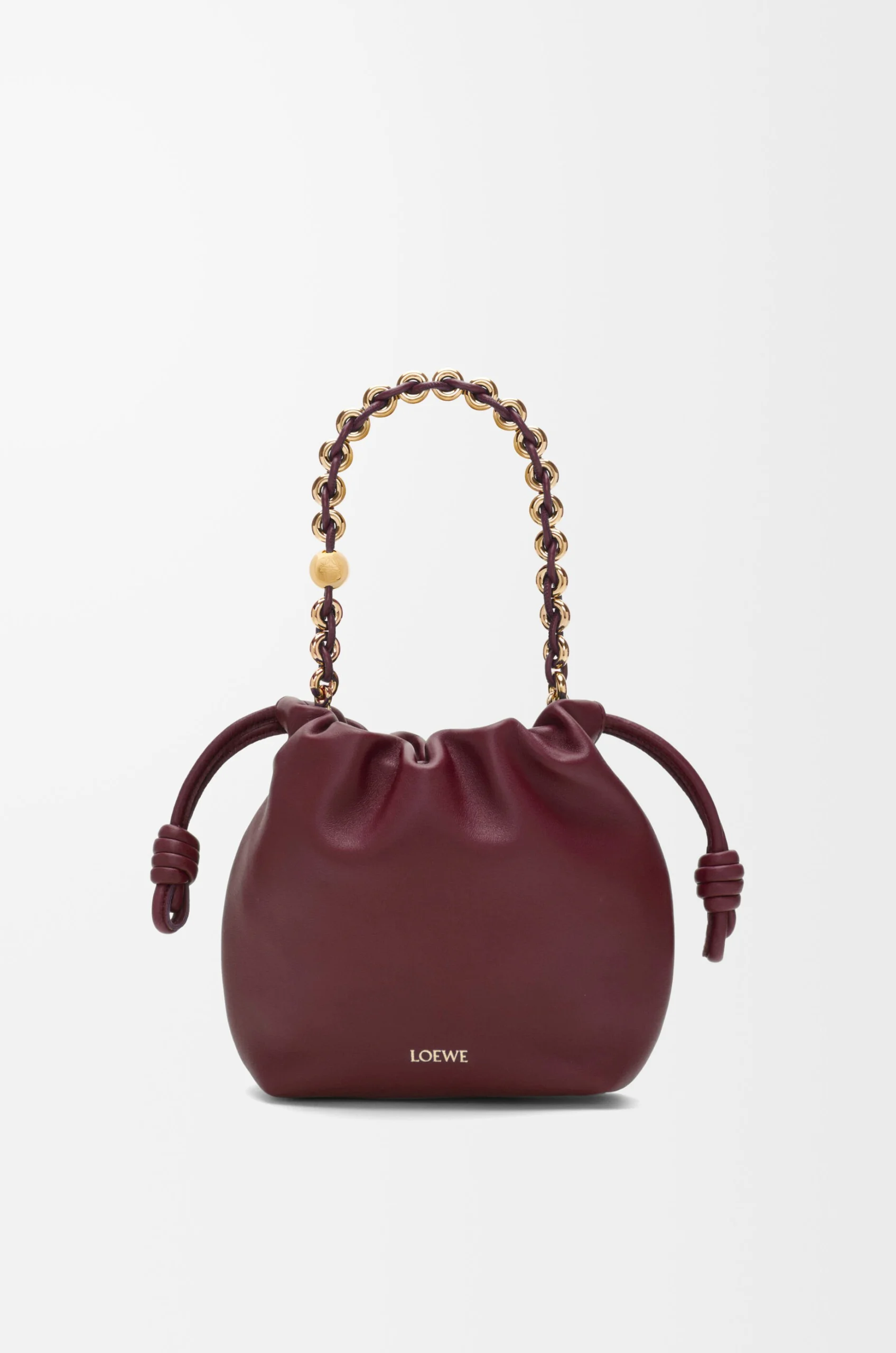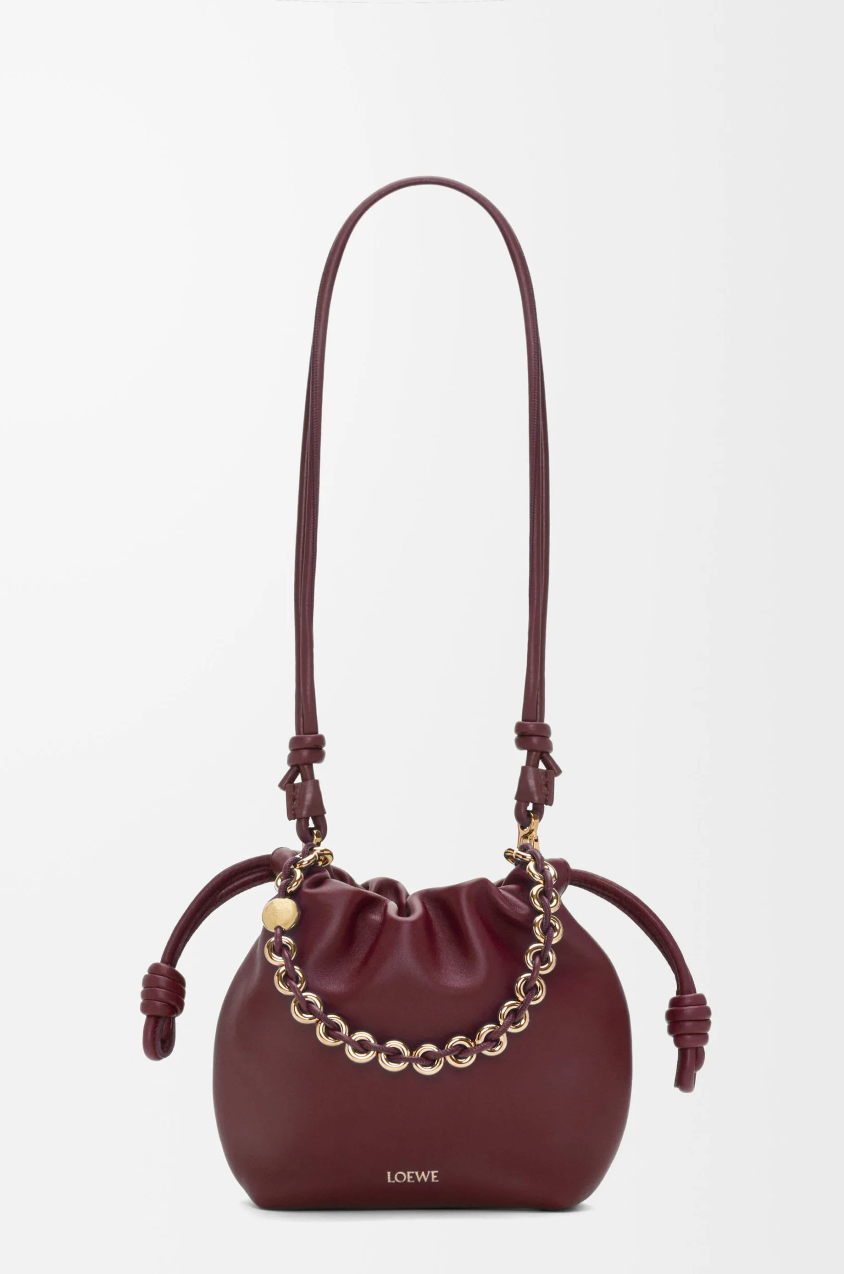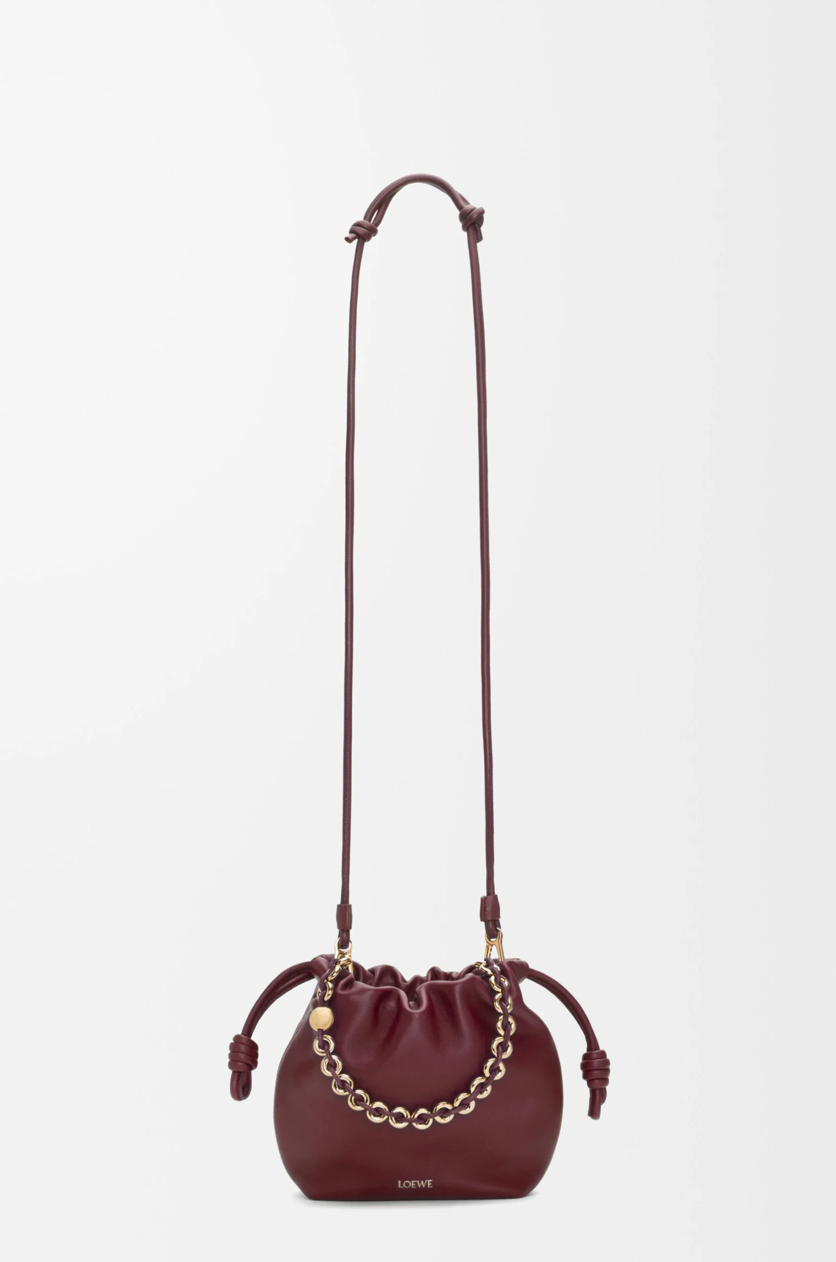 The Flamenco purse is a lightweight and soft bag with a ruched shape, historical knot drawstrings and a donut chain. This mini