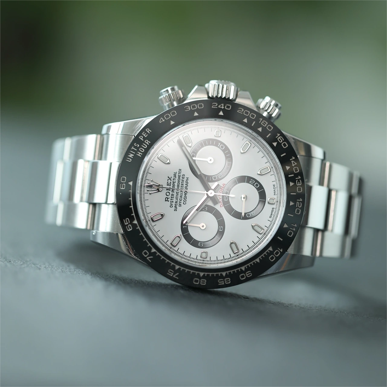 BEZEL MATERIAL: Monobloc Cerachrom showing Tachymeter Markings