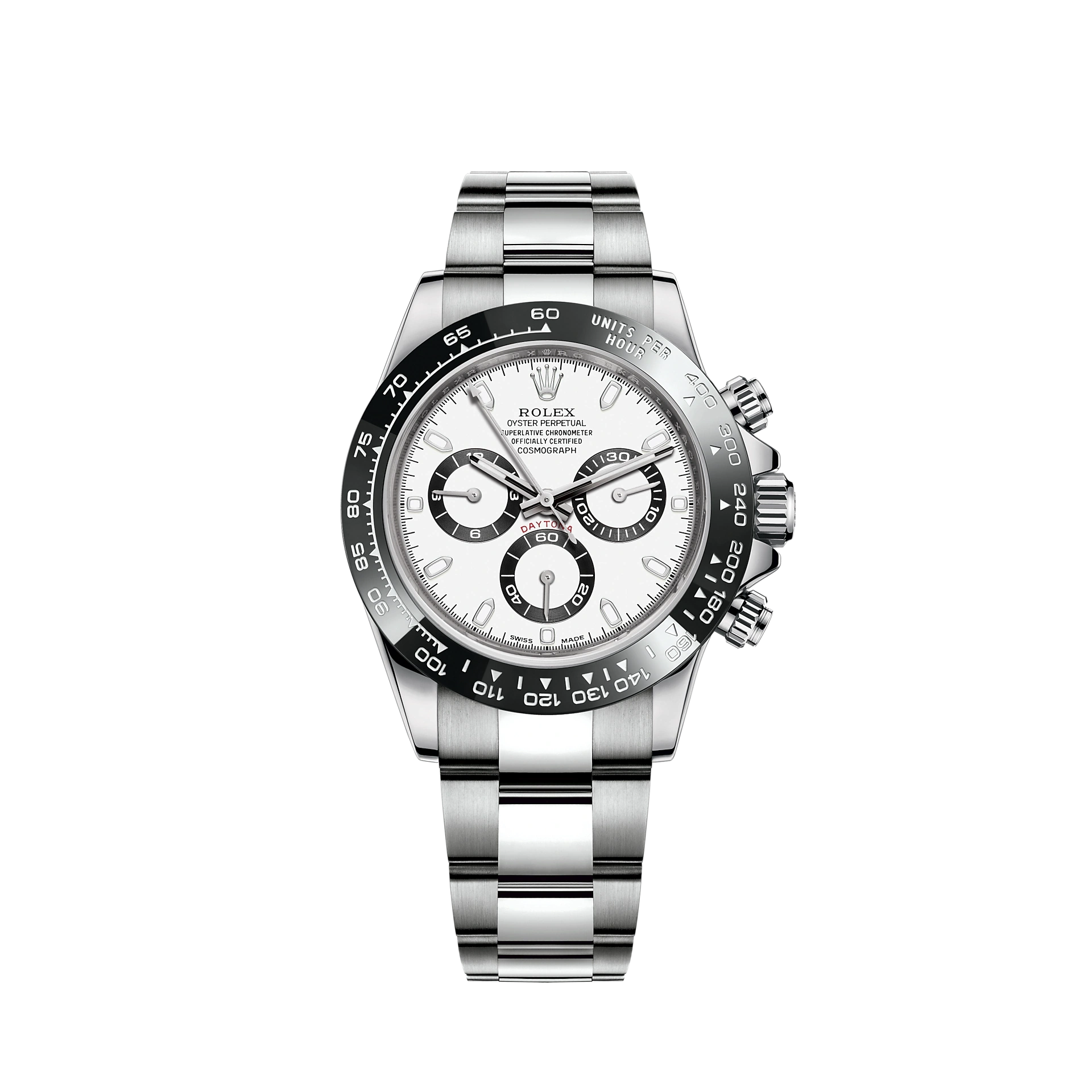 THIS OYSTER PERPETUAL COSMOGRAPH DAYTONA IN OYSTERSTEEL WITH A BLACK DIAL AND AN OYSTER BRACELET, FEATURES A BLACK CERACHROM BEZEL