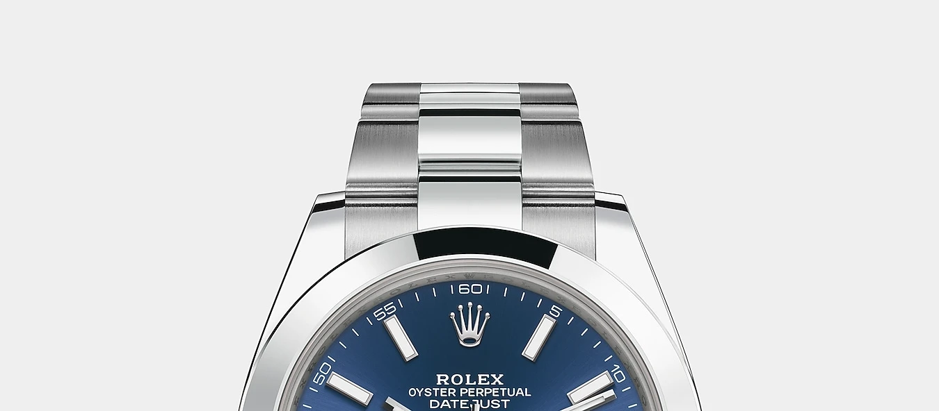THIS OYSTER PERPETUAL DATEJUST 41 IN OYSTERSTEEL FEATURES A BRIGHT BLUE DIAL AND AN OYSTER BRACELET.