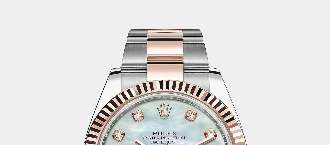 THIS OYSTER PERPETUAL DATEJUST 41 IN OYSTERSTEEL AND EVEROSE GOLD FEATURES A WHITE MOTHER-OF-PEARL, DIAMOND-SET DIAL AND AN