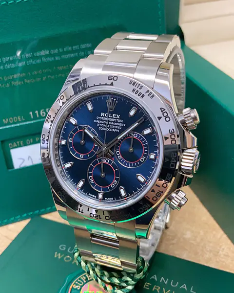 This Oyster Perpetual Cosmograph Daytona in 18 ct white gold, with a bright blue dial and an Oyster bracelet, features an 18 ct