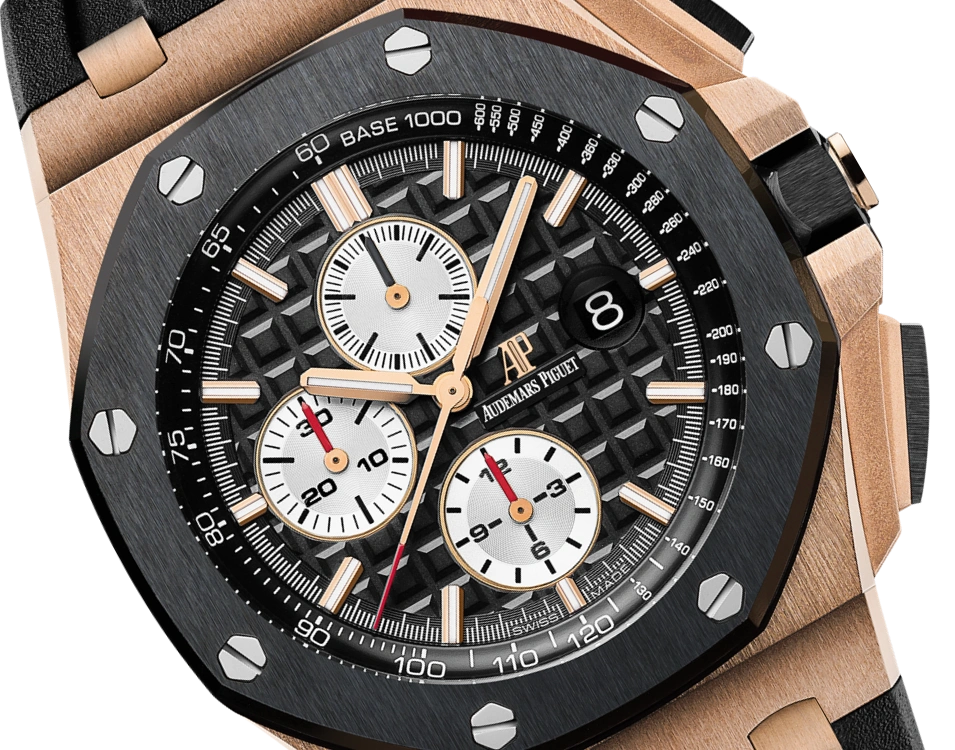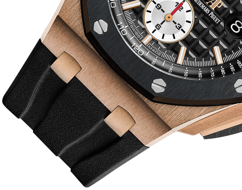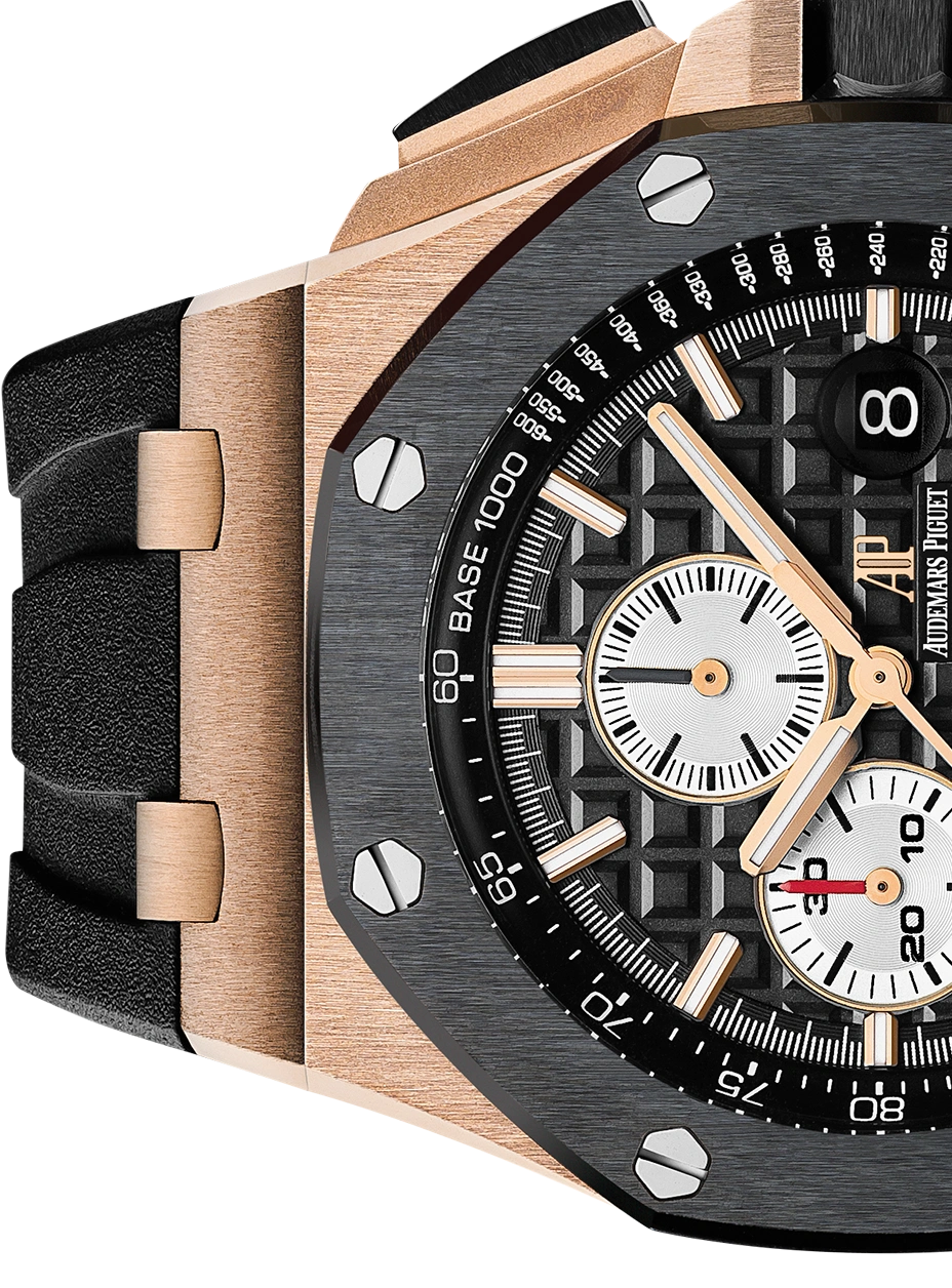 18-carat pink gold case, glareproofed sapphire crystal and caseback, black ceramic bezel, screw-locked crown and pushpieces, pink
