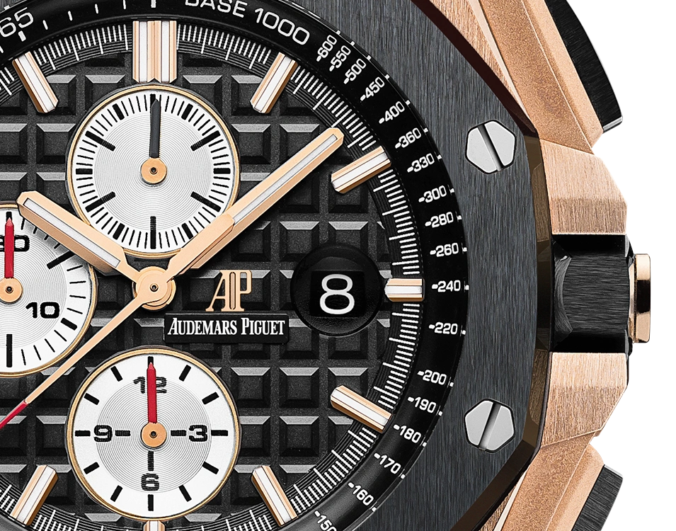 Black dial with “Méga Tapisserie” pattern, silver-toned counters, gold applied hour-markers and gold Royal Oak hands with
