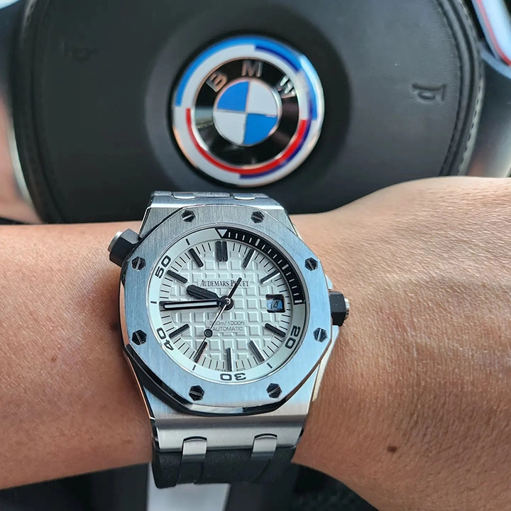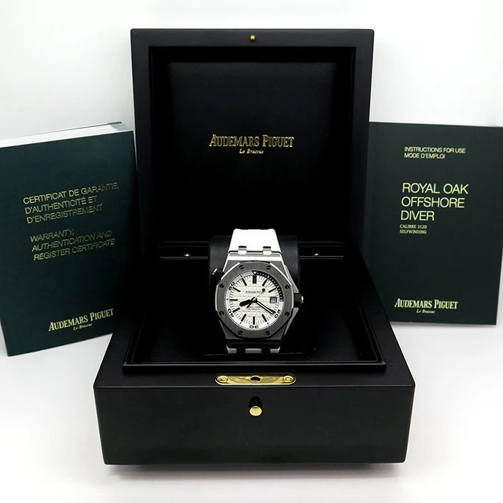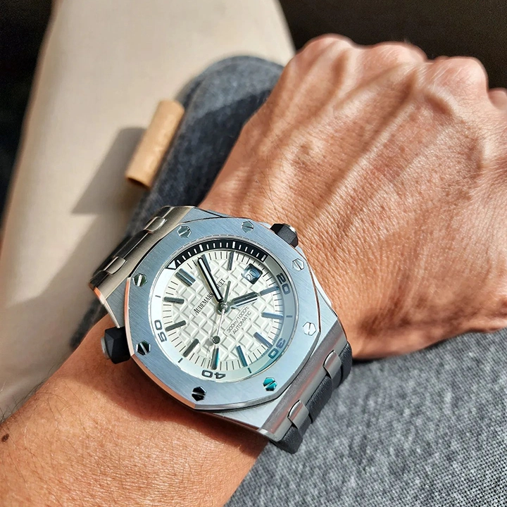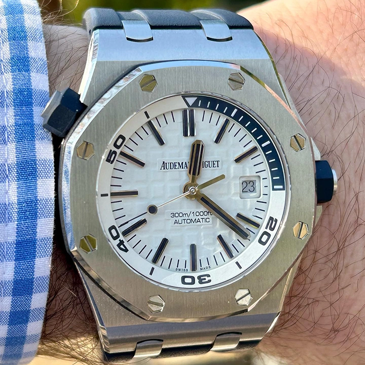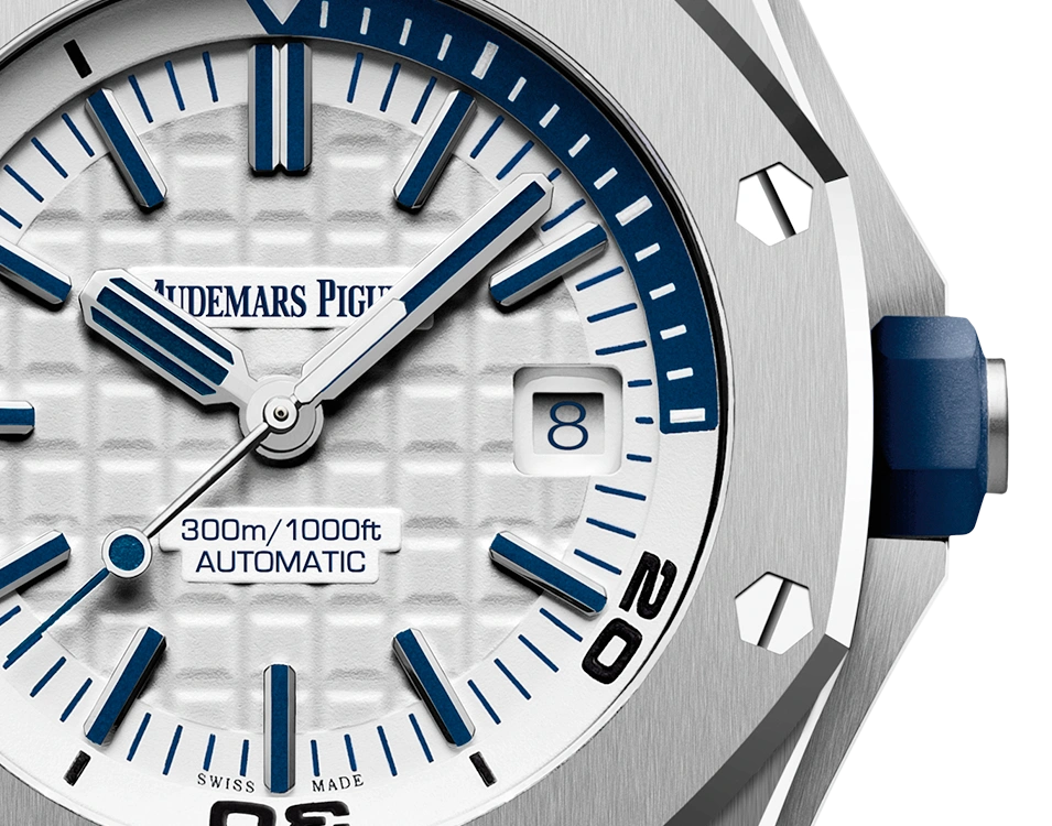 markers and Royal Oak hands, and the white rotating inner bezel with diving scale and blue 15-minute scale display.