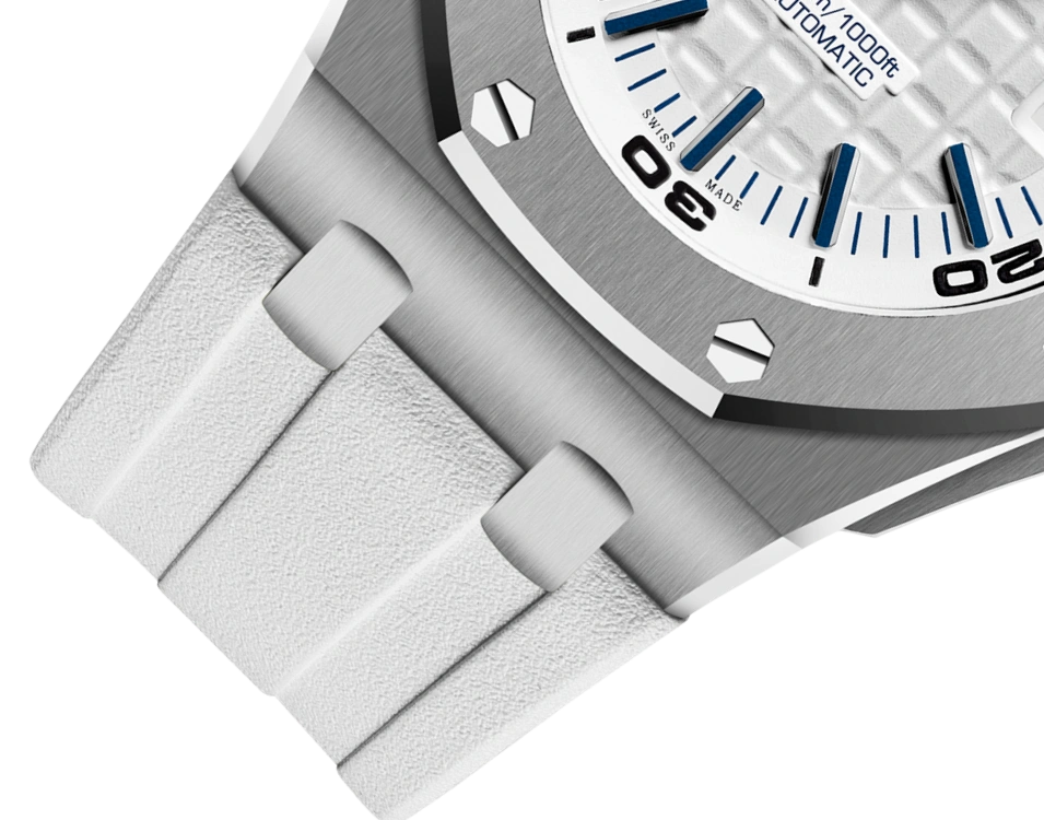 The refined design of the Royal Oak Offshore diver’s watch features a stainless steel case, white dial and strap. The Royal Oak