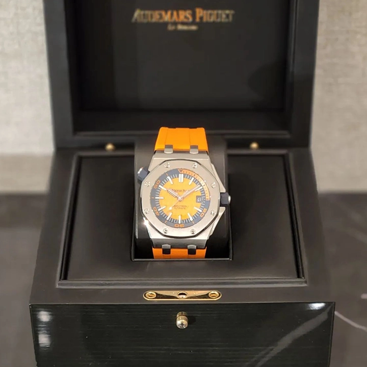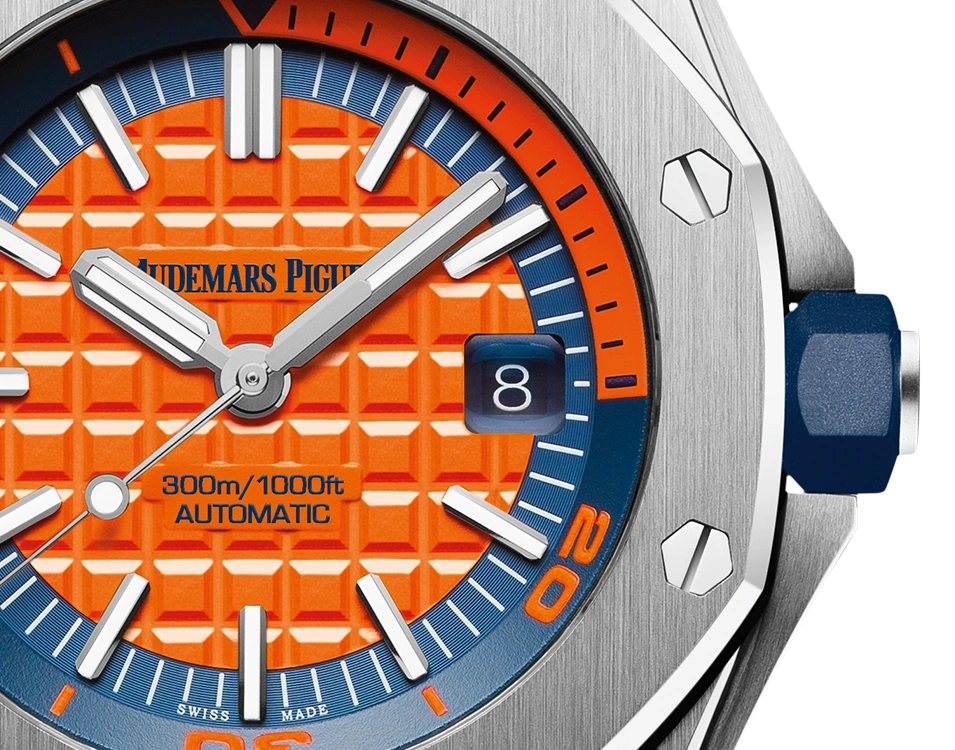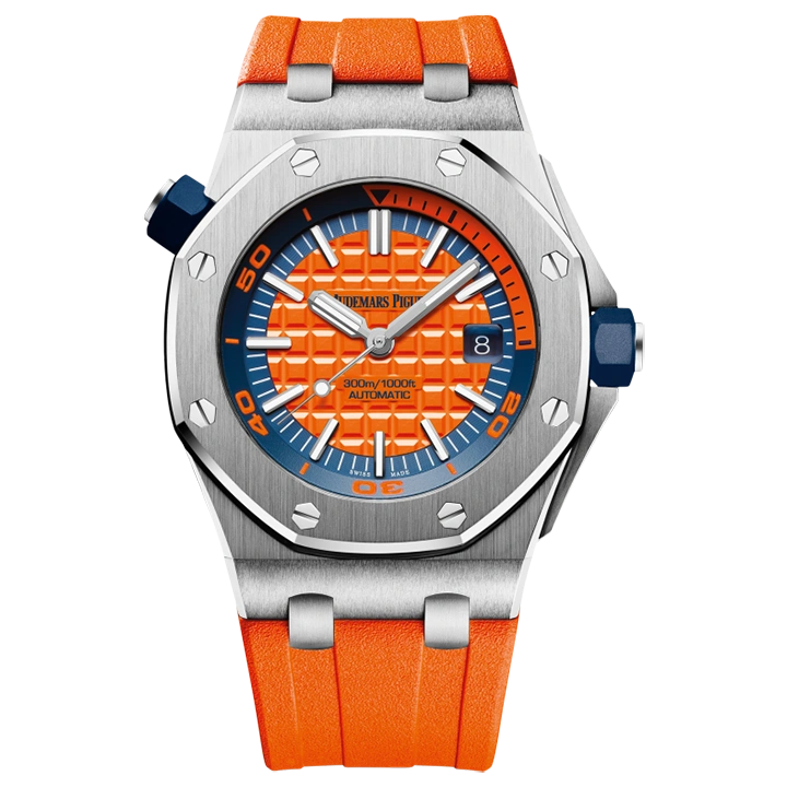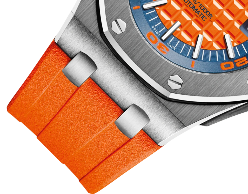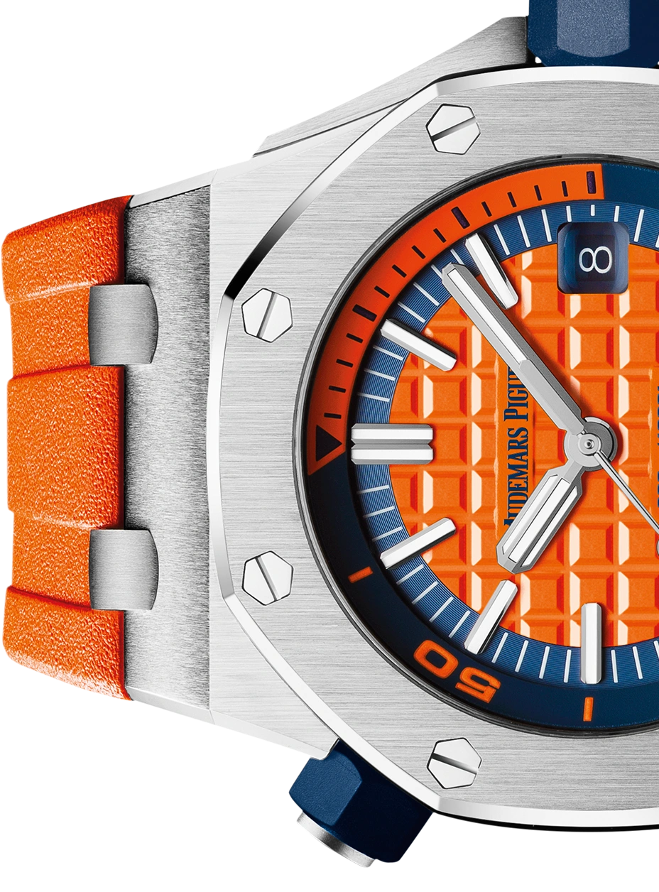 Bright tangerine orange dial with “Méga Tapisserie” decoration, white gold applied hour-markers and Royal Oak hands. A rugged