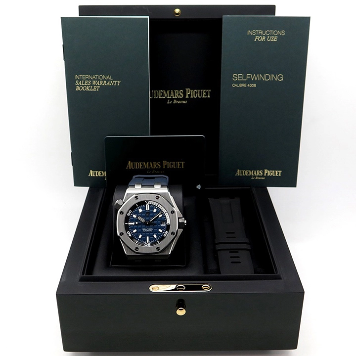 Blue dial with “Méga Tapisserie” pattern, white gold applied hour-markers and Royal Oak hands with luminescent coating, black