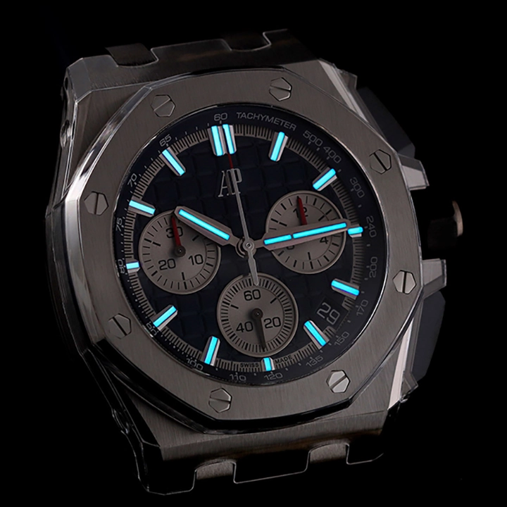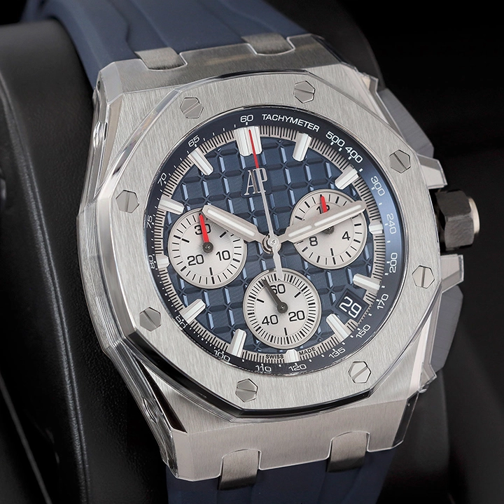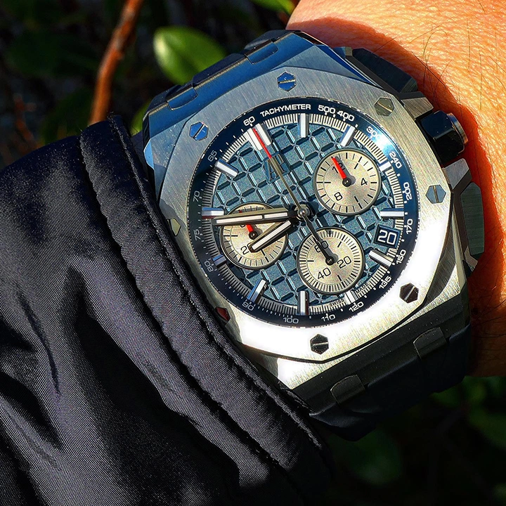 This all-titanium Royal Oak Offshore in 43 mm sports a blue “Méga Tapisserie” dial with high-end finishing as well as the