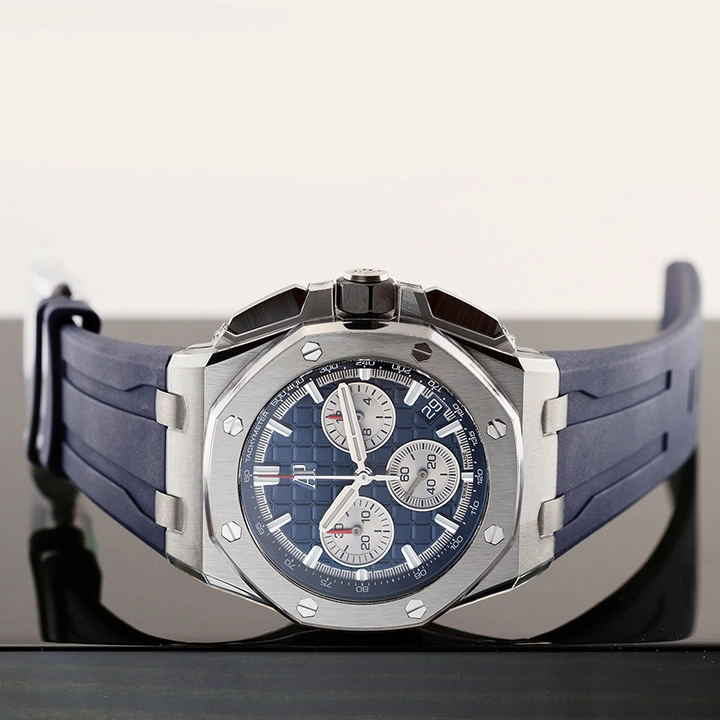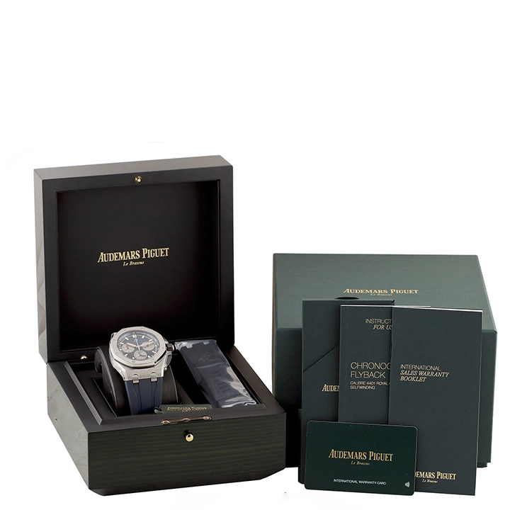 Blue rubber strap with titanium AP pin buckle and interchangeable strap system. Additional black rubber strap