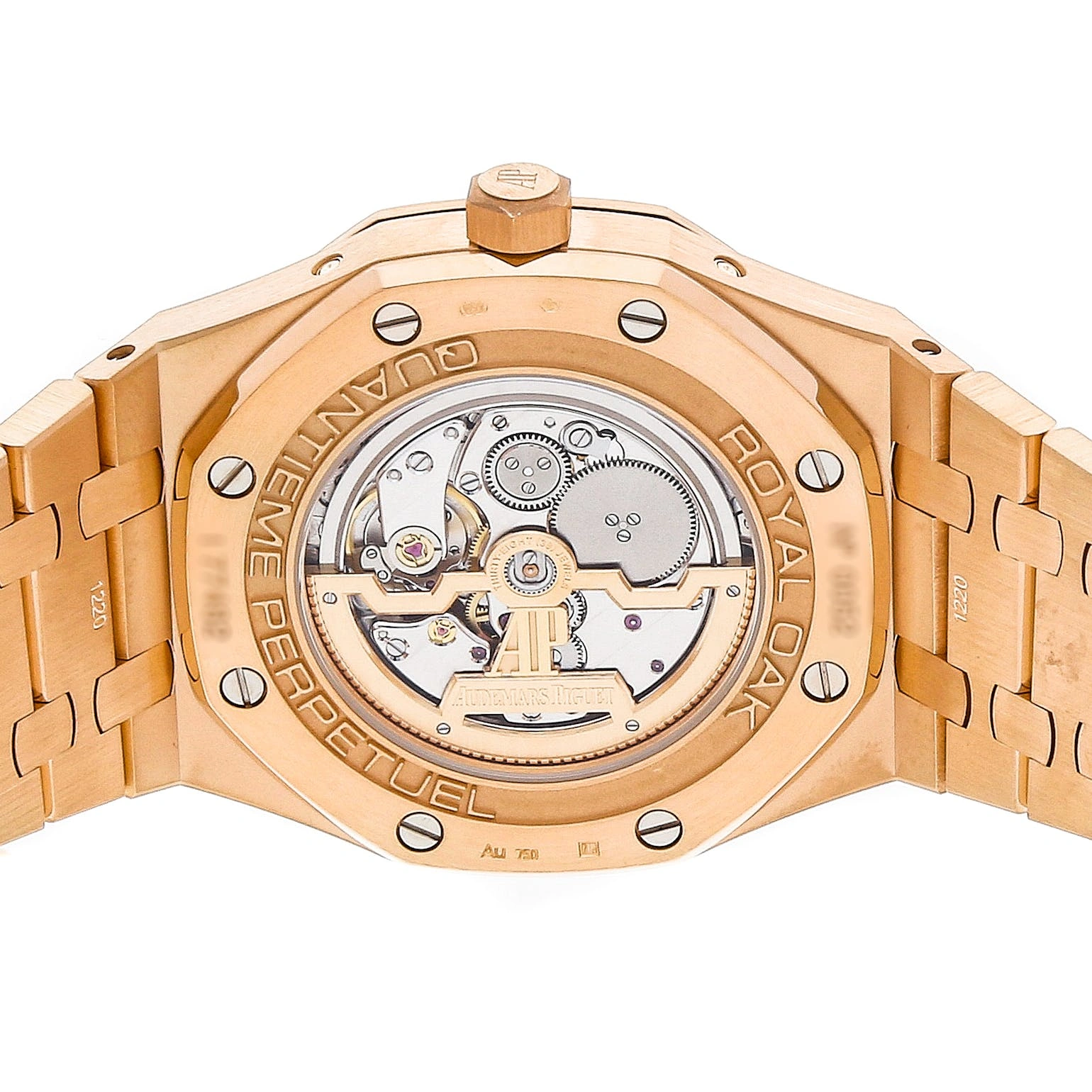 blue sub-dial with rose gold luminescent applied hour-markers and Royal Oak hands, blue inner bezel