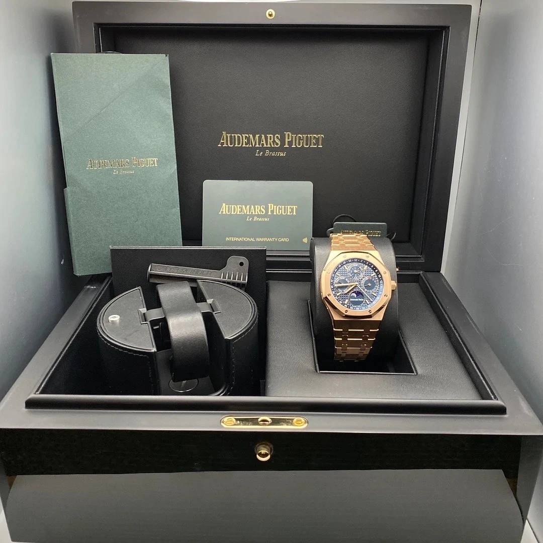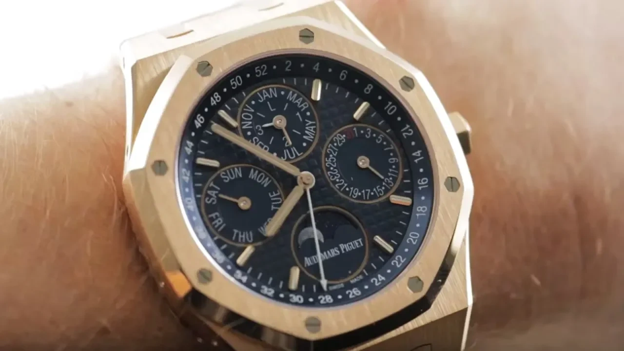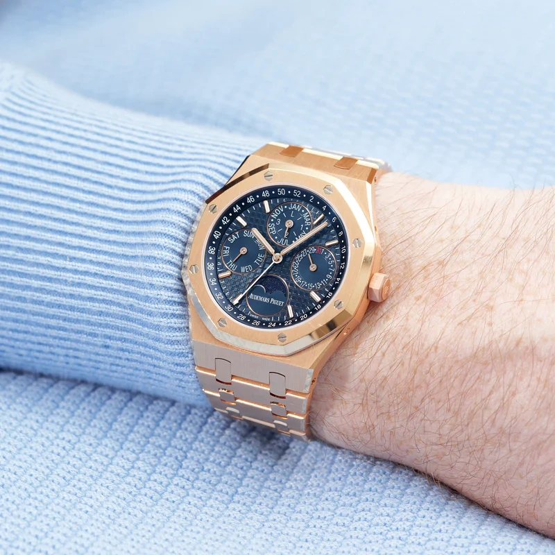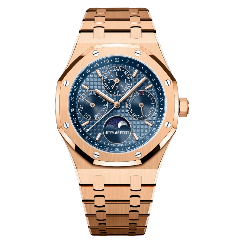 The blue shades of the Royal Oak Perpetual Calendar’s dial provide a powerful contrast with the 18-carat pink gold case and