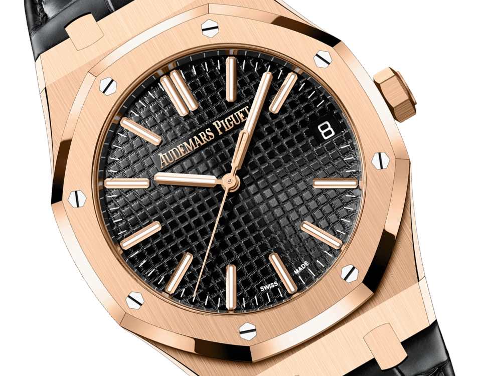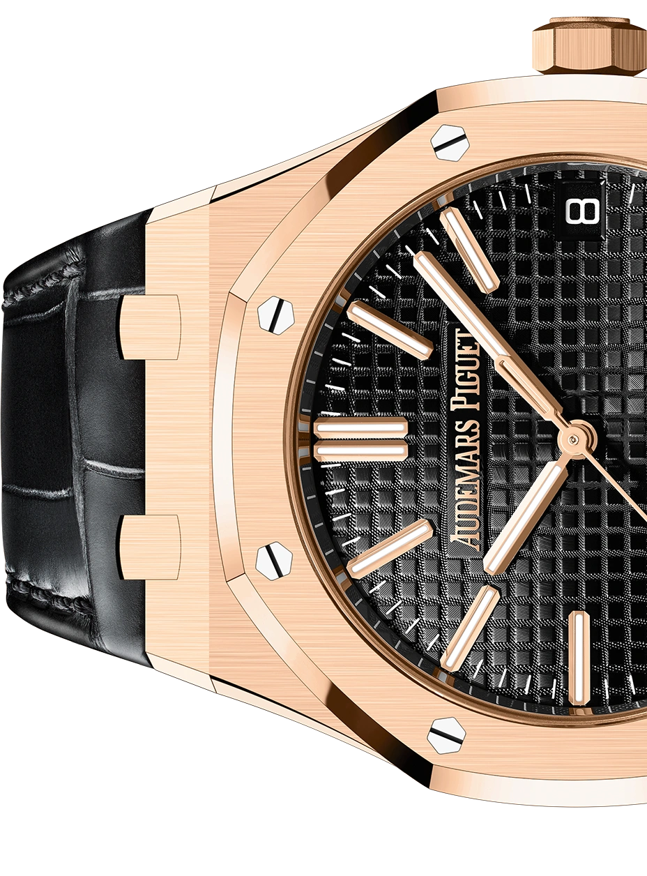 This 18-carat pink gold Royal Oak Selfwinding in 41 mm is endowed with the new design evolution and sports a black Grande