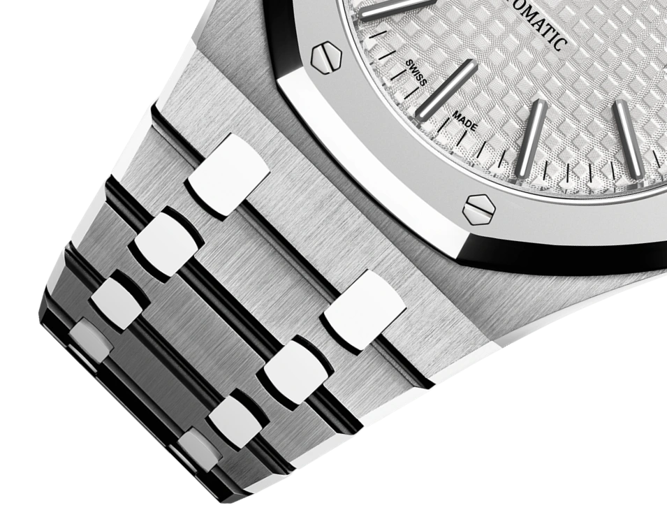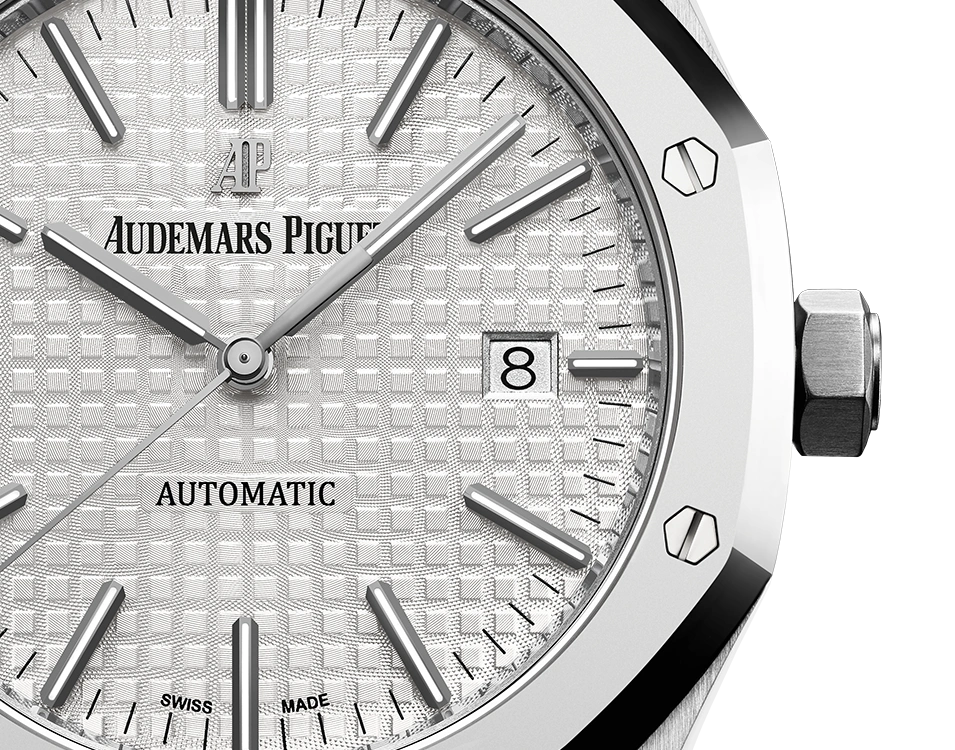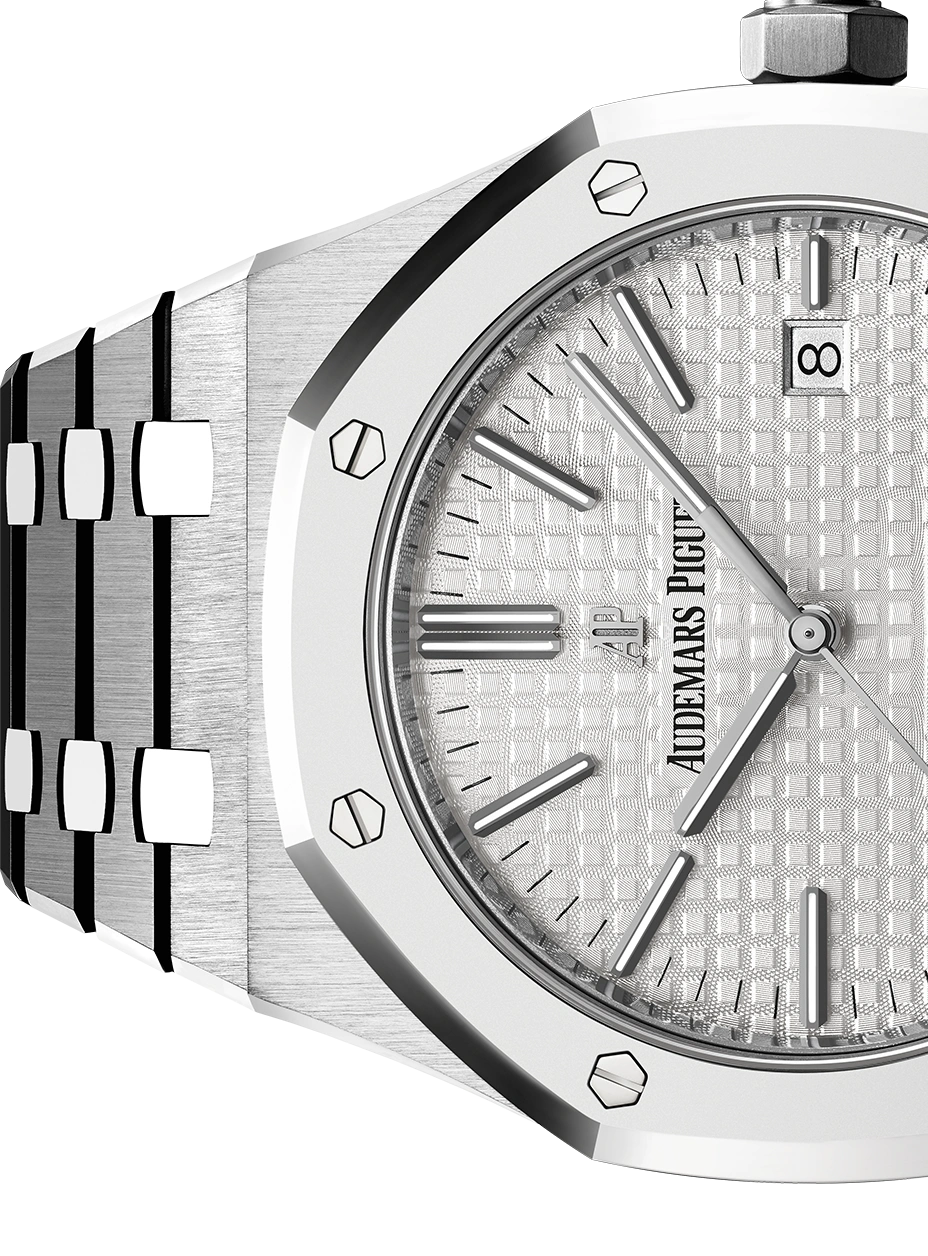 Rhodium-toned dial with “Grande Tapisserie” pattern, white gold applied hour-markers and Royal Oak hands with luminescent coating