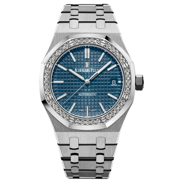Blue dial with “Grande Tapisserie” pattern, white gold applied hour-markers and Royal Oak hands with luminescent coating.